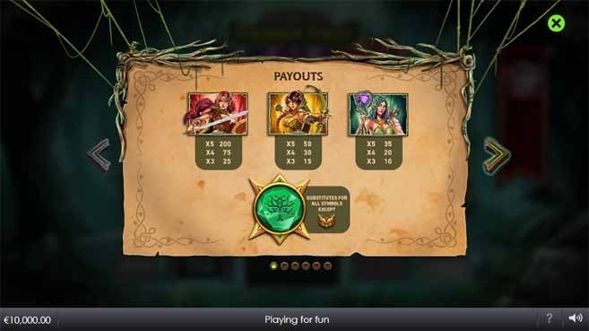 The background behind the reels contains a dark and creepy looking forest, featuring grass, rocks and a pond. On the reels are forest animals such as panthers, owls, tigers and bears. Three female warrior characters fill other positions on the reels. One warrior is a knight, one is an archer and one is a mage.The wild symbol in the game portrays an emerald forest. A Golden Owl serves as the scatter symbol in the game.