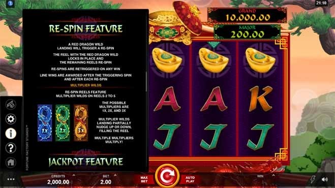 Players that get a win after a re-spin, the streak continues until the first re-spin that does not result in a winning combination of symbols landing on the reels. Only the red wild symbol remains a sticky wild while free re-spins are being played. The green and blue dragon wild symbols disappear.