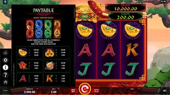 The wild symbol shows up on the second and fourth reels. When it does it expands to cover the whole area, and it pays out a cash prize. It then sticks to the reels while players get a free re-spin. This produces wild dragon symbols in not only red, but also blue, gold and green.