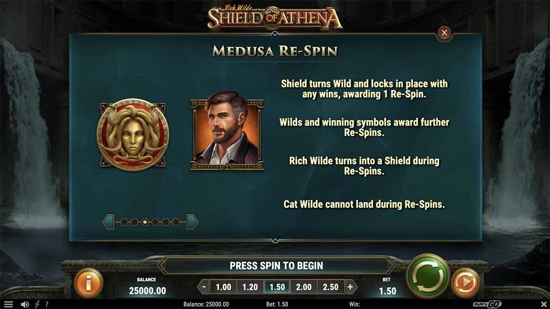 Getting three or more of the Rich scatter symbol on the reels at once the Gorgon Medusa Gaze bonus feature is activated. It only takes three scatters to get 10 free spins, but five scatters get 15 free spins. They can be re-triggered at any time during the bonus. This happens whenever the Shield appears on the reels. The Shield may appear on the reels in both regular game play and during the free spins. When it does, the Shield takes the form of Medusa’s face. At that time, it changes from a standard symbol to a wild symbol.