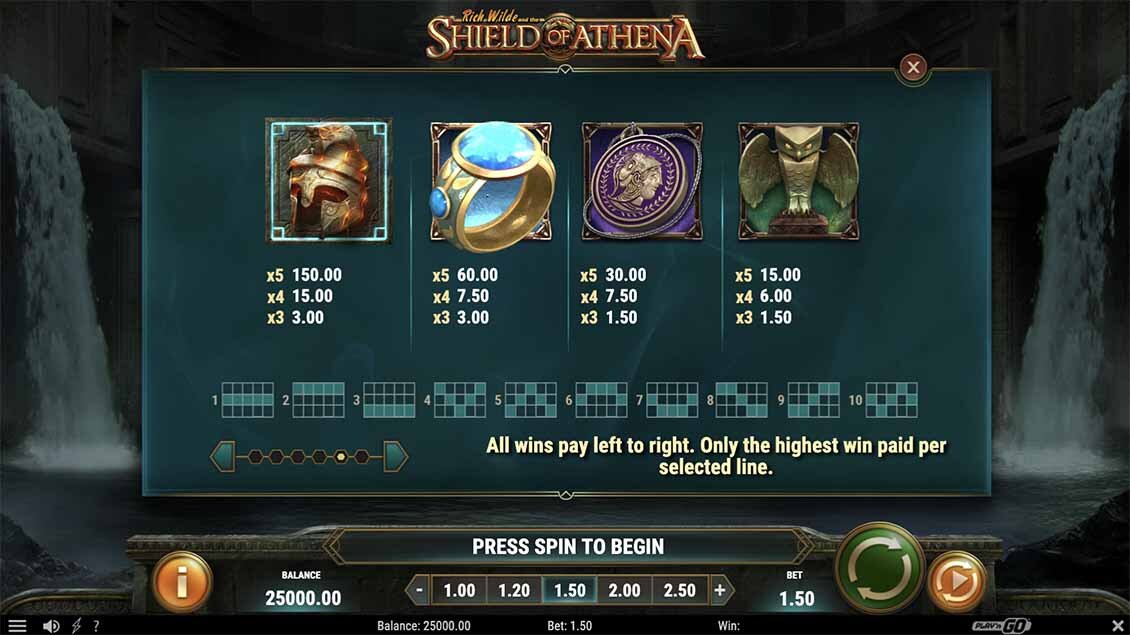 Set in a temple underground in Atlantis, there are waterfalls on both sides of the reels. The graphics and symbols support the game’s Greek Mythology theme. On the reels players will see many elements of the theme reflected in the symbols. They include both the helm and the shield of Athena, Pendant of Courage, Ring of Wisdom, and the Golden Owl. Rich serves as the scatter symbol, while Cat serves as the wild symbol.