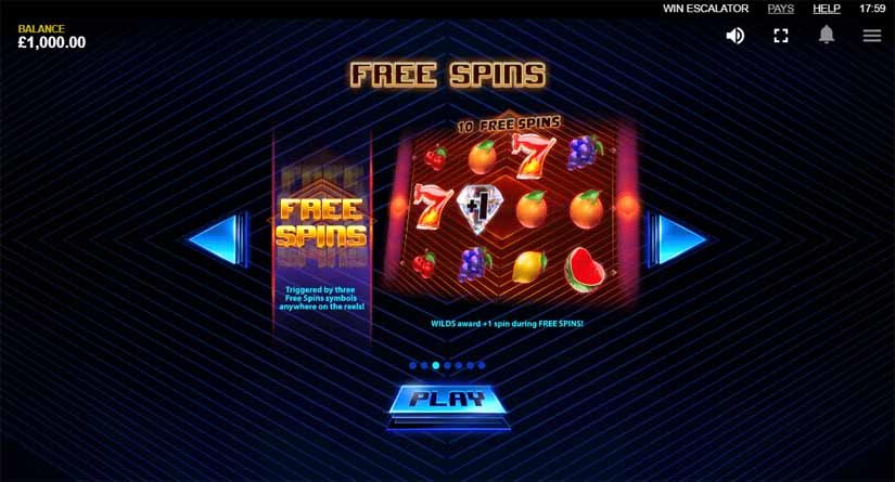 Set against the backdrop of a starry black night, the reels in Win Escalator are transparent. The symbols on the reels are reminiscent of the classic slots. They include a bell, the number seven, a shamrock, and brightly coloured oranges, grapes, watermelons, lemons and cherries. A diamond is the wild symbol in the game. The scatter symbol is the words “free spins.”